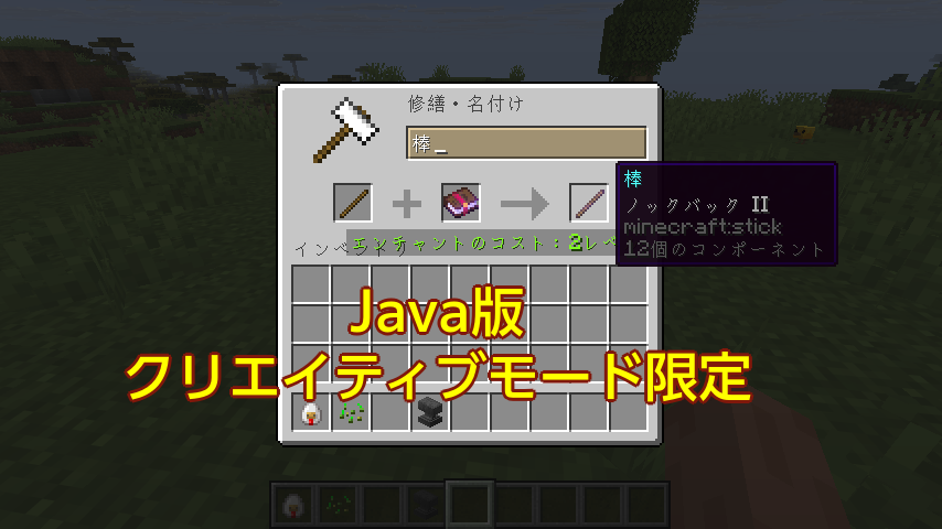 Java版に限り、クリエイティブモードを使うと、金床でエンチャント本を使い、棒など通常ではエンチャントが付けられないアイテムにも、さまざまなエンチャントを付けることができます。