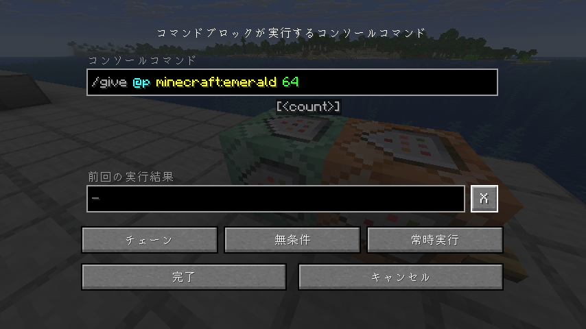 画面を閉じたら、1つ目のコマンドブロックにボタンを取り付けて押しましょう。夜に変わった後にエメラルド64個が入手できていれば成功です。