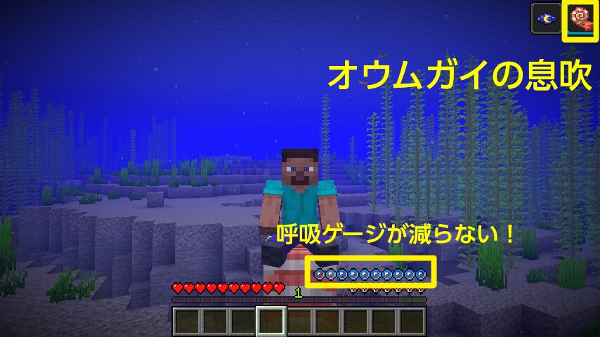 オウムガイに乗っている間は、「オウムガイの息吹」のステータス効果が発揮され、呼吸を気にすることなく水中を移動できます。オウムガイの息吹に、時間制限はありません。