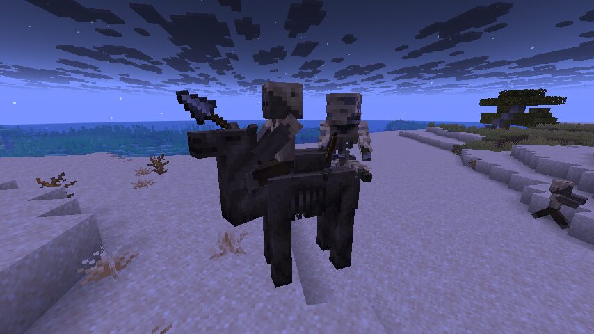 ラクダハスクは、砂漠にスポーンするアンデッド系のラクダです。明るさ0以下で、槍を持ったハスクや、パーチドを乗せてスポーンします。2体乗っていることもあります。洞窟ではスポーンしません。