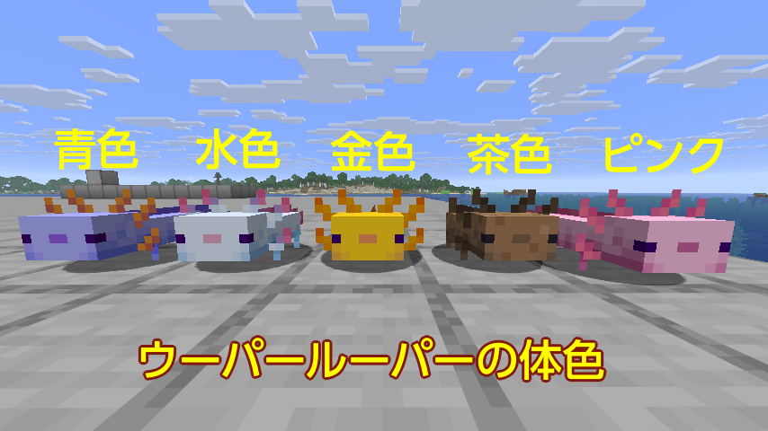 マインクラフト(マイクラ)のウーパールーパーが繁殖するとき、1200分の1という低確率で青色のウーパールーパー(通称:青ウパ)が産まれます。