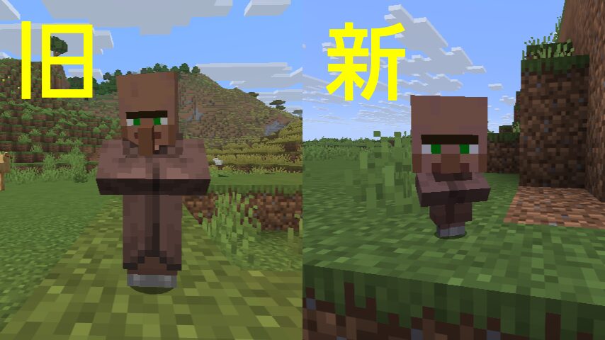 村人の赤ちゃんを比較してみましょう。「旧」の現在の村人は大人と見た目が変わりませんが、新しい方は二頭身で明らかな違いがあります。