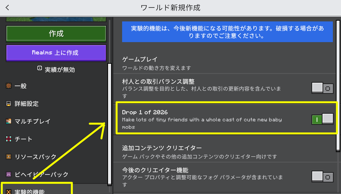 実験的機能としては、赤ちゃんモブリニューアルなど26.1アップデートの内容の一部が試せるようになりました。
